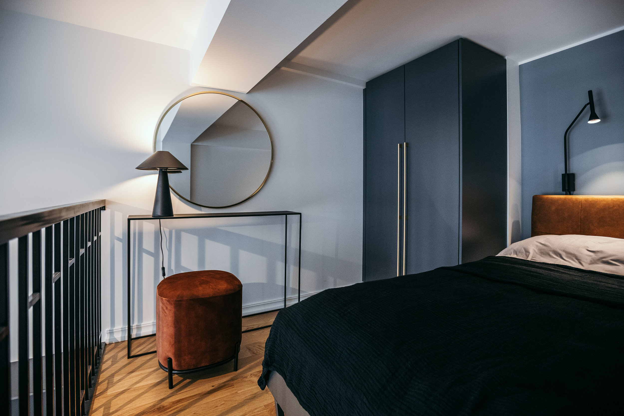 Valmis terviklik kujundus Tartu vanalinnas asuvale loft-tüüpi üürikorterile. Kitsasse läbi kahe tasapinna paikevale 30,4m² suurusele pinnale tuli koos panipaikadega ära mahutada kõik eluks vajalik. Esimesel tasapinnal paikneb esik koos mahuka sisseehitatud garderoobiga, vannituba, köök-elutuba ning teisel tasapinnal magamistuba. Läbiva toonina kasutasime tumehalli, mis on kombineeritud efektse bordoopunasega. Soliidsust lisavad messingust detailid ja peegelpinnad.